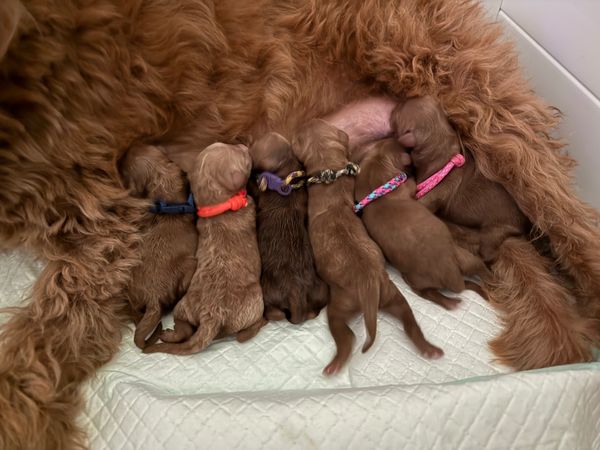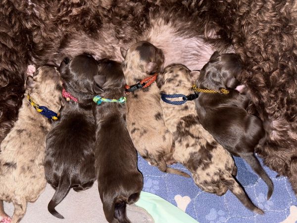 Tillie had 4 males and 2 females. They were delivered on 9/13/2025. All are healthy and happy. Mini chocolate Goldendoodles. See available puppies for more information